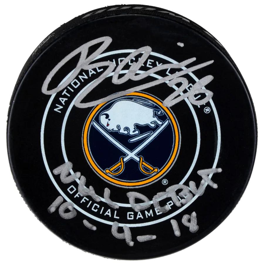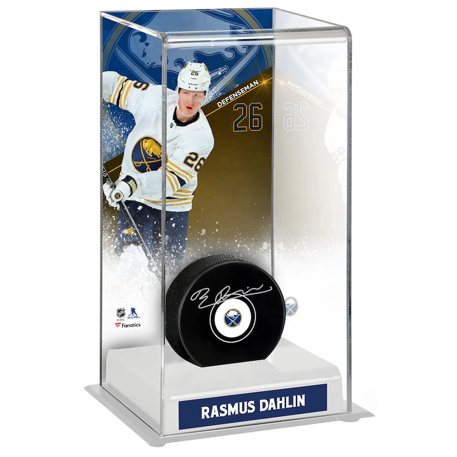 Autographed Buffalo Sabres Rasmus Dahlin Fanatics Authentic Puck with 50th Anniversary Alternate Jersey Deluxe Tall Hockey Puck Display Case